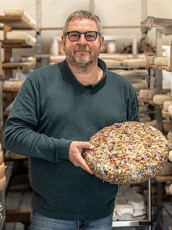 Ce qui guide notre artisan au quotidien, c’est cette idée simple : s’il y a bien une chose qui mérite d’être mise en valeur, c’est la matière première elle-même. Le lait de vache et de chèvre qu’il transforme est bio, local, traçable jusque dans les prairies où broutent les troupeaux. Et c’est volontaire : il veut des fromages qui ne pourraient pas naître ailleurs. De cette exigence découle tout le reste. L’atelier est un lieu de production, mais aussi un lieu où l’on parle saisons, météo, pâtures, nourriture des animaux, tout ce qui influence le lait, et donc le goût.